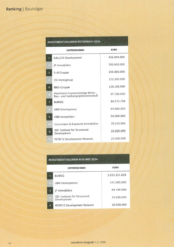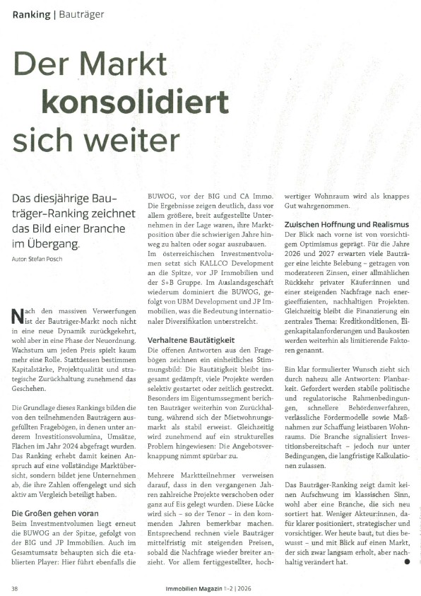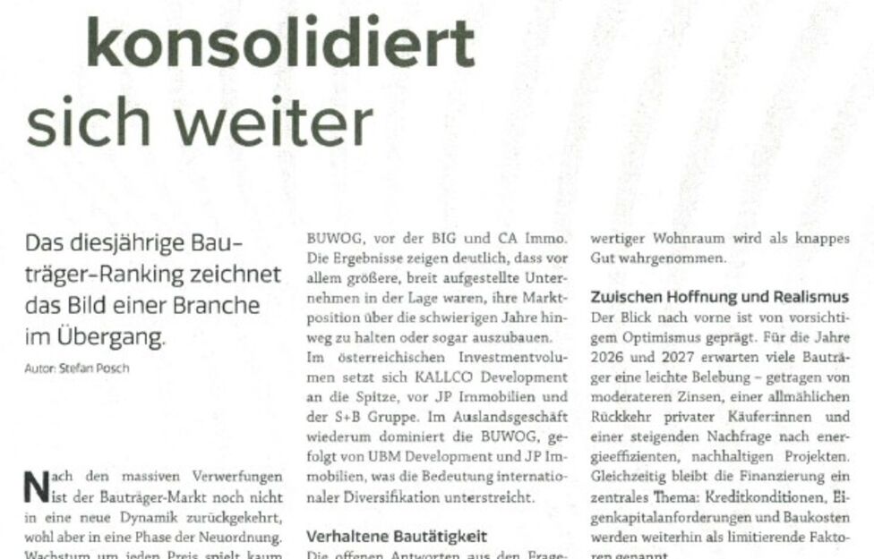 Das Bauträgerranking 2026 des Immobilien Magazins zeigt, welche Bauträger sich trotz herausfordernder Marktbedingungen erfolgreich behaupten. Steigende Baukosten und strengere Finanzierungsrichtlinien prägen weiterhin die Branche.